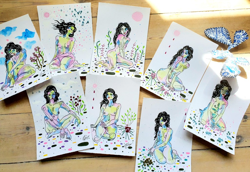 I created these illustrations in Marielyst, South of Denmark, (where the picture on the top of this post was taken, actually) the past month. I made them on a thick watercolor paper, with acrylic paint, ink and embroidery (can you see the beautiful contrast of the thread on paper?), and the first round, which were the size of postcards, have already all gone to my patreons at a contributor level or higher (12usd and up).