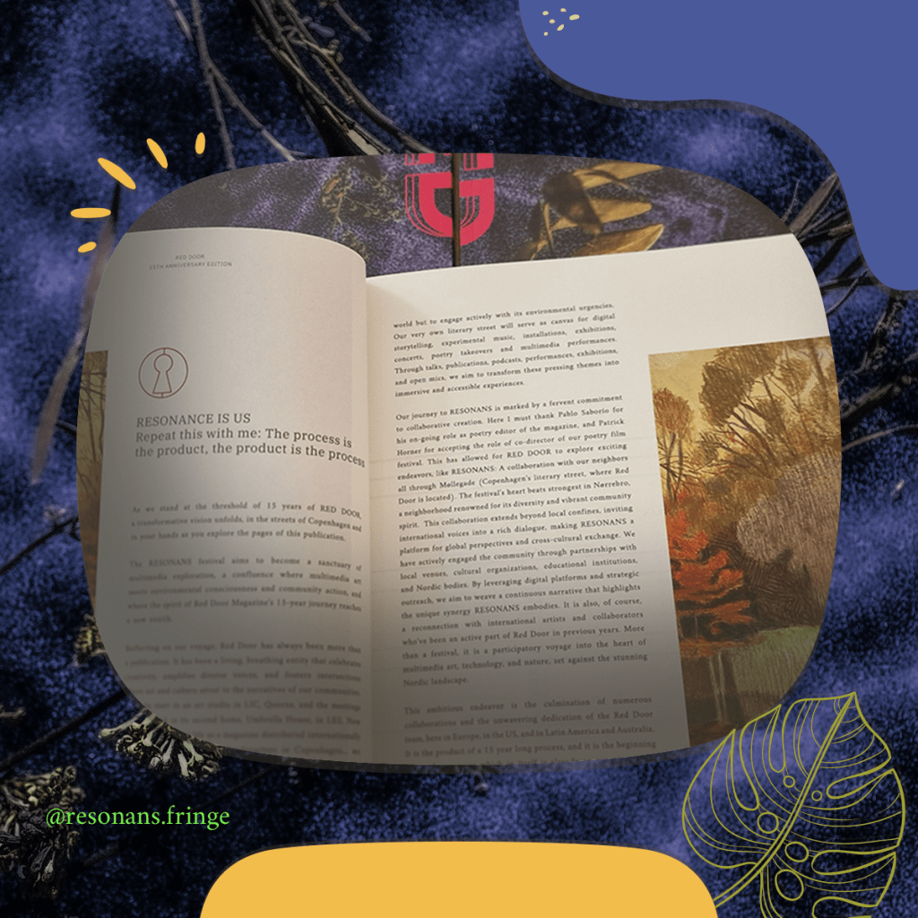 I am also incredibly excited about the beauty of RESONANCE IS US, the limited-edition book publication that is also RED DOOR MAGAZINE’s #37 issue, which looks so damn good because multimedia artist Daniel Malpikka said yes to being the art director of the project (and the Kone foundation gave their support for this collaboration. We’ll have copies during the festival but if you already know you’d like to reserve one, please do so here.