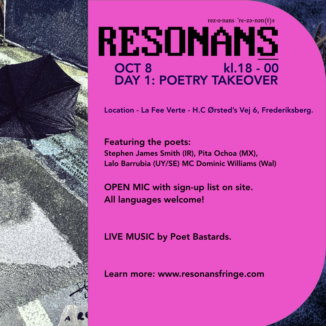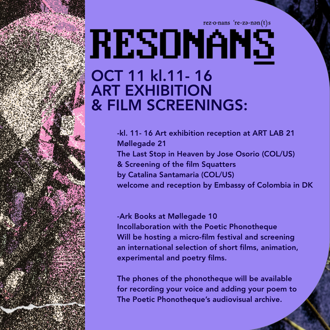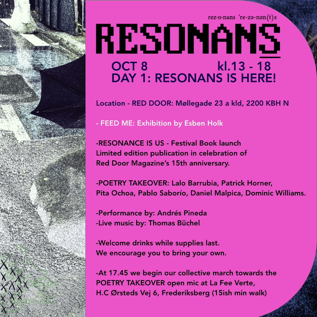 And lastly of course, RESONANS FRINGE itself, with around 30 events, 6 solo exhibitions, a film festival, a bookfair, a street party! People coming from Colombia, Mexico, the US, India, Europe… to celebrate this multimedia, multicultural, multilingual gathering in honor of Red Door’s 15th anniversary. Click here to see the whole program... and here’s a preview:
