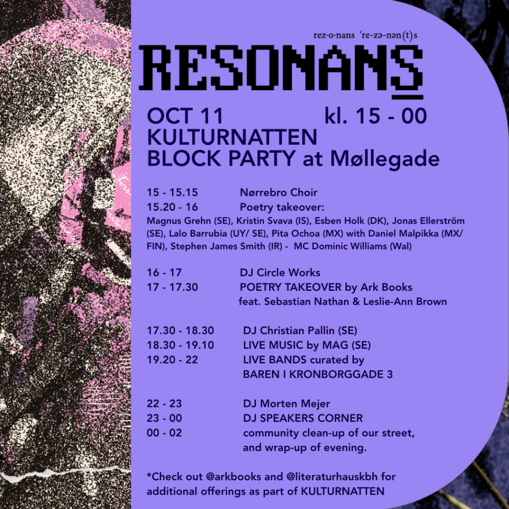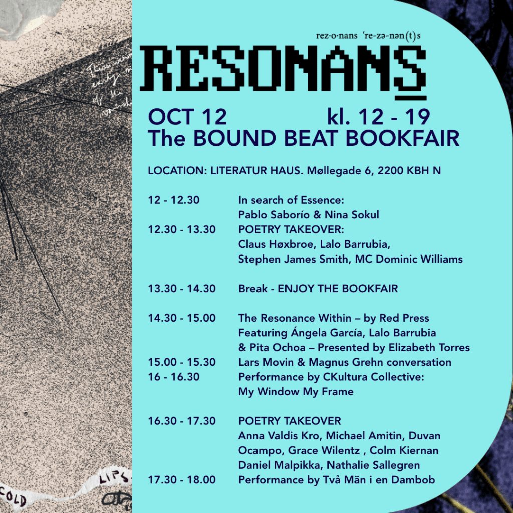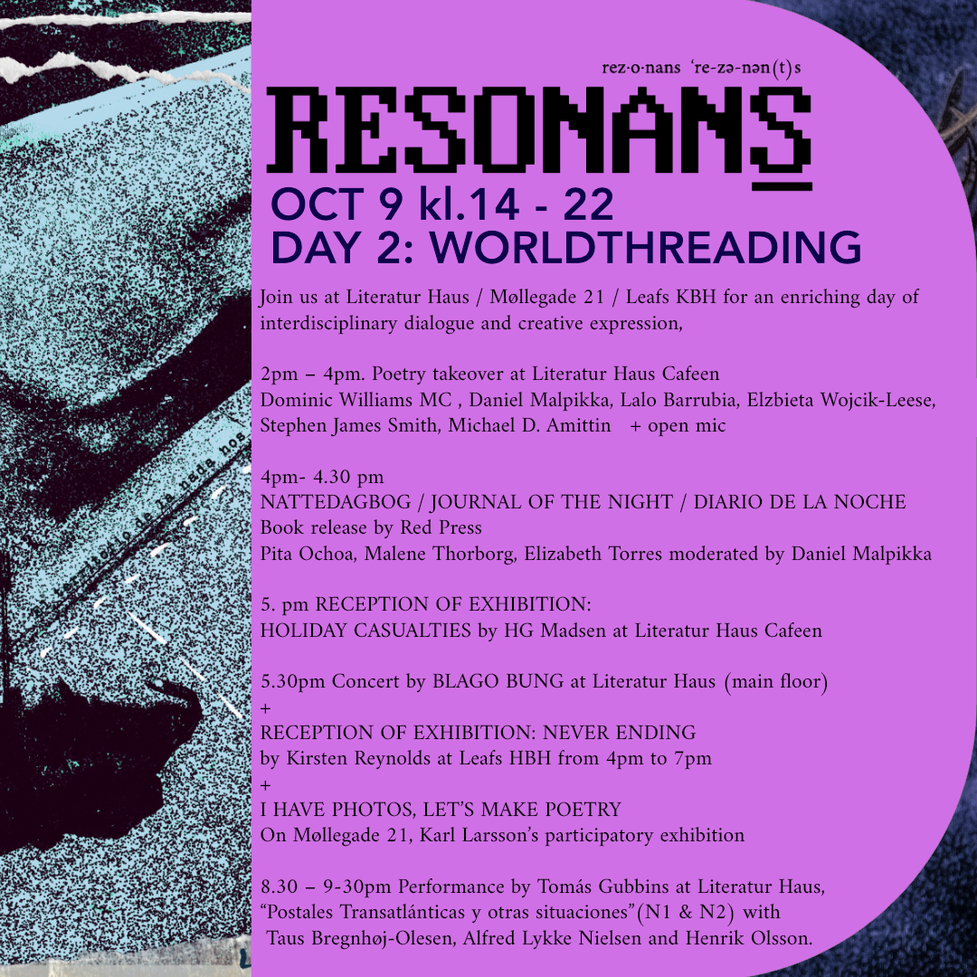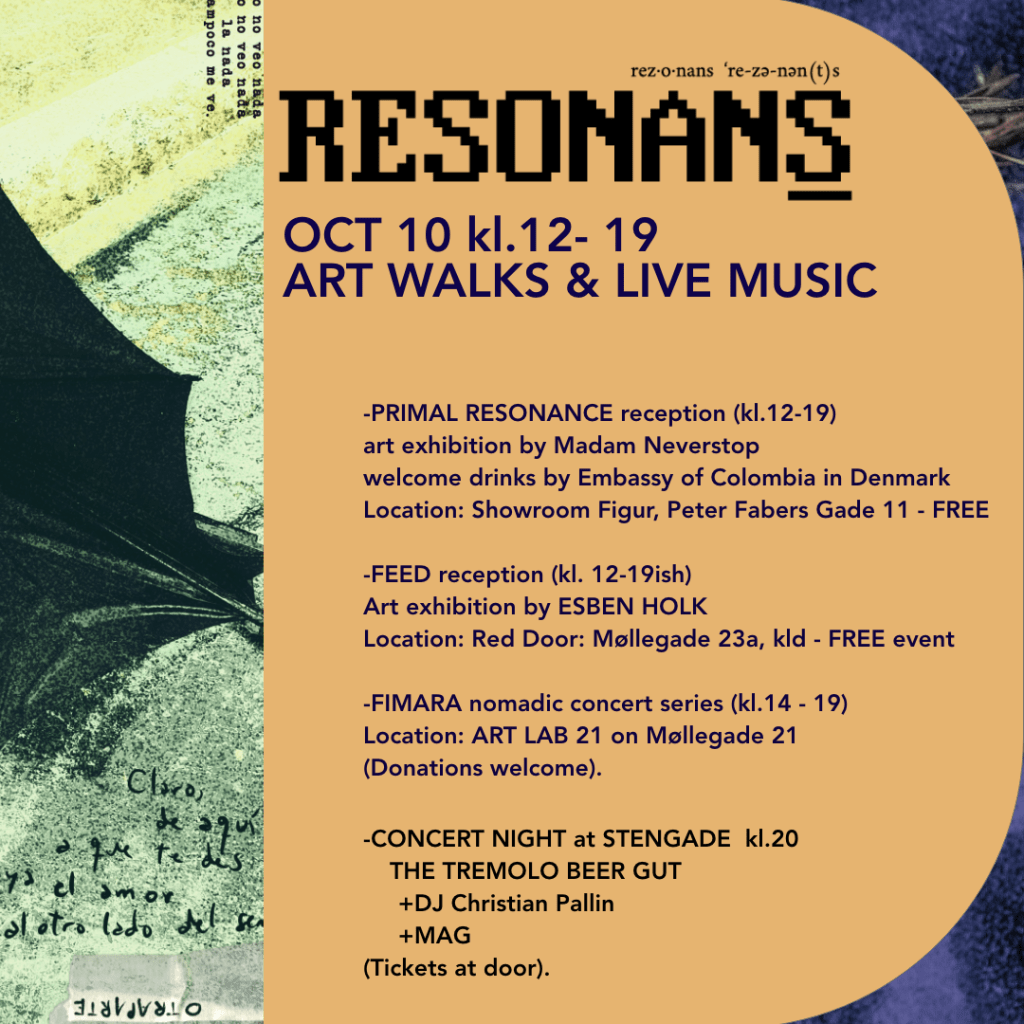 And lastly of course, RESONANS FRINGE itself, with around 30 events, 6 solo exhibitions, a film festival, a bookfair, a street party! People coming from Colombia, Mexico, the US, India, Europe… to celebrate this multimedia, multicultural, multilingual gathering in honor of Red Door’s 15th anniversary. Click here to see the whole program... and here’s a preview: