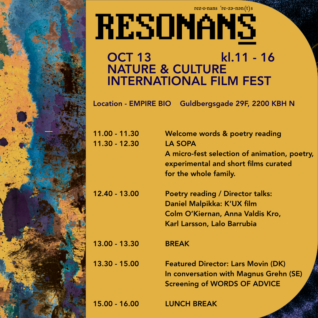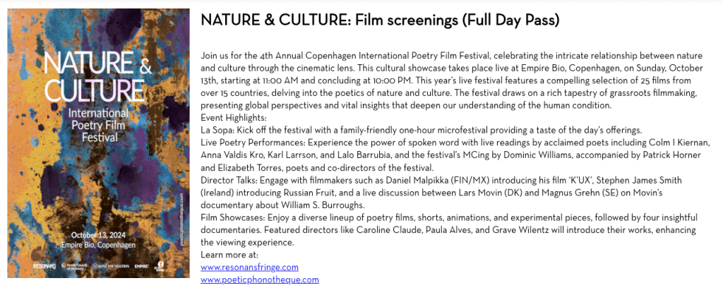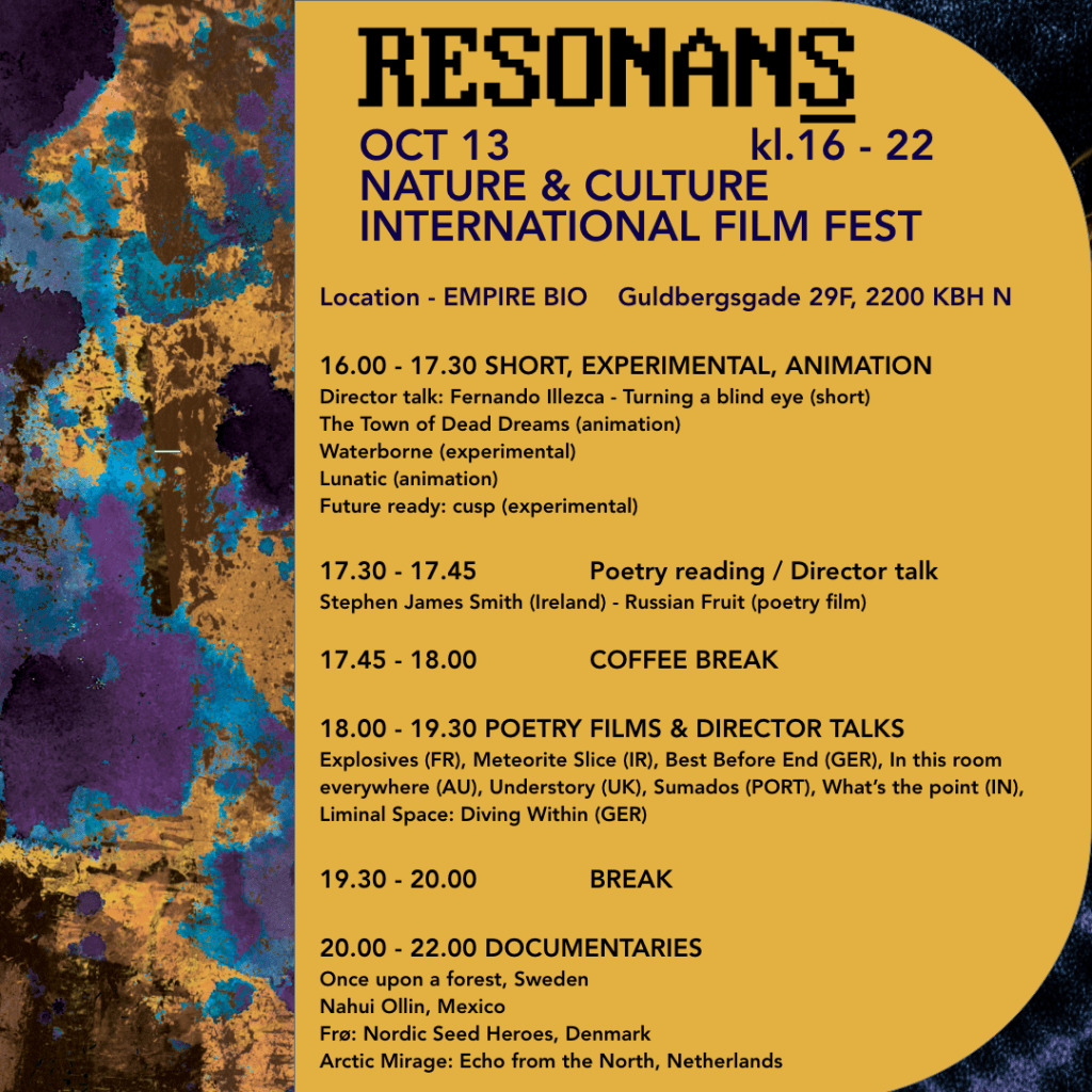 The festival will take place on October 13, screening 35 films, including a talk with film director Lars Movin and several director introductions and poetry readings. The tickets are only 100kr for the whole day so you can walk in and out as you see fit. Please reserve your seat here.