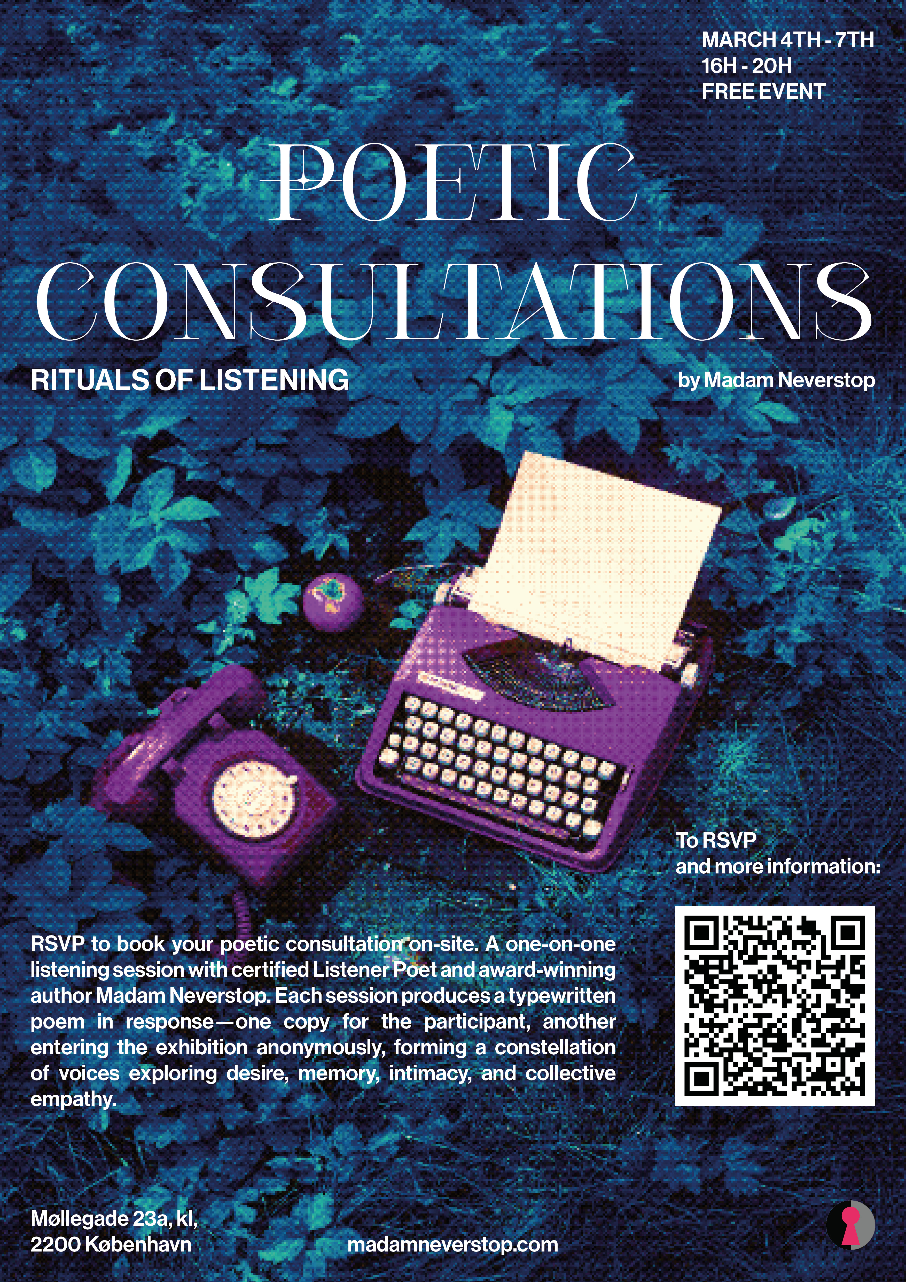 Simultaneously, for the individual experience, I will be doing Poetic Consultations, which are one-on-one sessions where I hold space to listen to you share something you carry that is heavy, secret, weighing you, or that you’re excited about and want to honor. I listen for around 20 mins and then as a response I type a poem for you, which you can take as a keepsake. This is a free event, my way of giving back kindness and calm to our community, and I definitely encourage you to RSVP your spot for your session, as the spaces are limited.