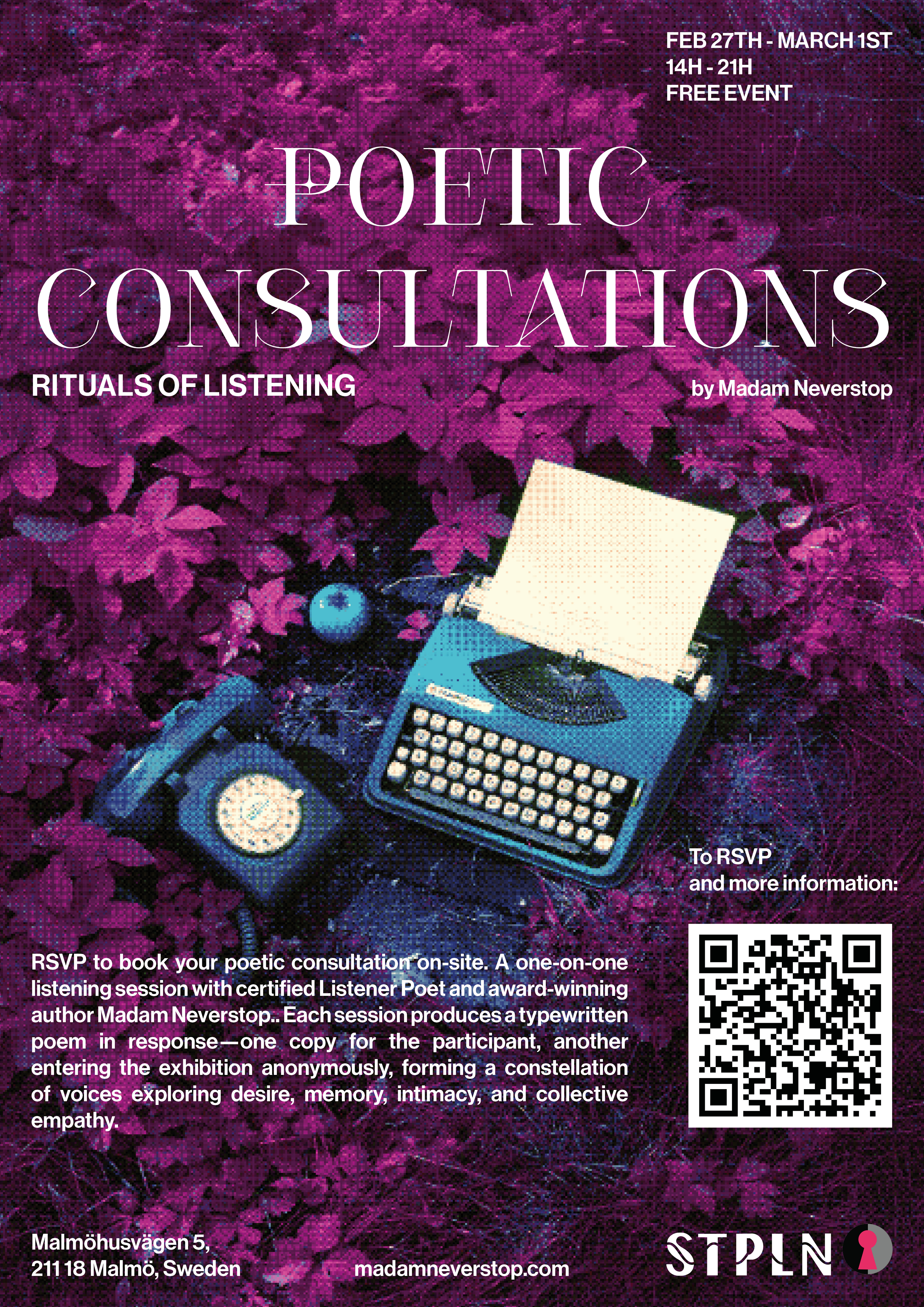 From February 27 to March 1st (in Malmö at STPLN ) and March 4 to the 7th at Red Door I’ll be taking over with an immersive performance called Poetic Consultations, which invites the audience to come together and enjoy an exhibition and a time of active listening through soundscapes and performances of a select group of musicians (which I will begin announcing shortly).
