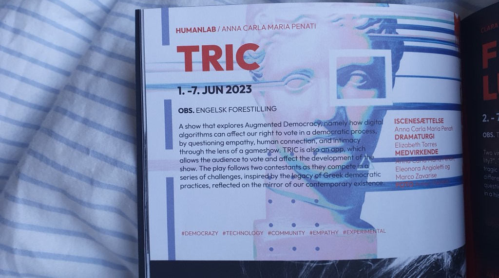 TRIC is also an app that allows the audience to vote and affect the development of the show. The play follows two contestants as they compete in a series of challenges, inspired by the legacy of Greek democratic practices, reflected on the mirror of our contemporary existence.