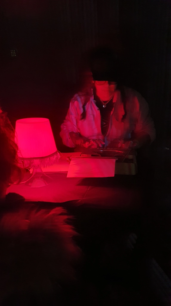 dynamic poetry readings and immersive multimedia performances that intertwine language, sound, and visual art. As an award-winning poet, her readings are celebrated for their lyrical depth and emotional resonance. Her performances, meanwhile, are sensory explorations that blend synthesizers, typewriters, projections, and live readings, creating environments where poetry becomes a living, breathing experience.